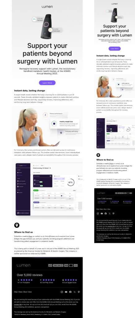 Our email design service builds a polished message you can submit to ASMBS for your attendee email deployment. You provide the content, and we turn it into a clean, branded layout that looks good on phones, tablets, and computers. No technical knowledge needed.
